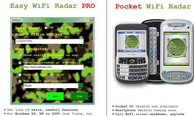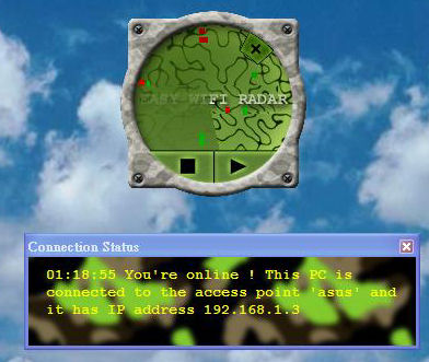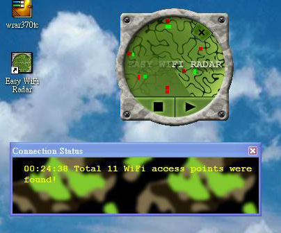 所以呢?不是Windows自已也有這樣的功能嗎?沒錯,不過,這玩意兒找無線網路速度比windows快,而且更敏感,對那些有限制的無線網路,它也會很聰明的跳掉不去試。而且使用方式和電視搖控器一樣簡單,你只要執行它,接上了自動就會連到IE視窗中開始讓你上網。換一個地方要重掃,也只要再按一下三角型的播放鍵就好了,全自動的過程會再來一次,只要小白的功力就能做到駭客的程度,很方便吧。跳出程式就是方塊停止鍵。雷達上的綠點表示可以接上的無線網點,紅點是受限制的(可能需要密碼)。它會自動掃過每一個綠點,如果這個綠點接不上,就會轉成黃點。全部掃完了如果沒有綠點,表示這裏沒有免費的節點,放棄吧。