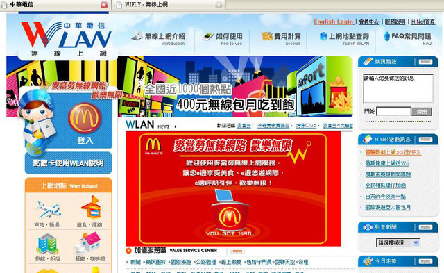 第二站,開到麥當勞門口,跳出來的是這個畫面,當然,這也要錢。中華電信的WLAN...
