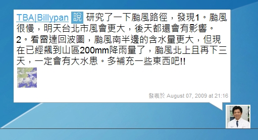 歷史天量的降雨是天災沒有錯,但是,降雨量就像地震的震度一樣,長期記錄降雨量的原因就是要提早預測水患的發生。這次水災發生的過程中,應該在8月7日就可以提早預防。我這不是空白說白話,因為當天我就發了一則噗浪(右下角有時間為証),提出『一定會有大水患』的說法。