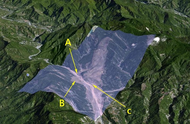 為了方便理解,我們先看一張走山後的衛星空照圖,加上3D後的立體效果。C點是小林村的所在地: