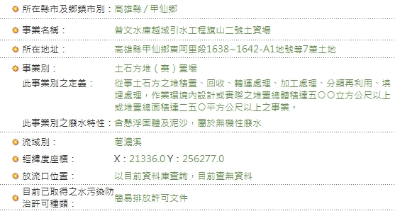 關於這個旗山二號土資場,廢土的來源是更上游的越域引水工程。這個土資場的地點有報紙標定在小林村的下游。水資局也因此說下游的土資場不可能影響到上游。但是真正的位置在那裏,其實是有詳細的經緯度座標的,記載在這裏: